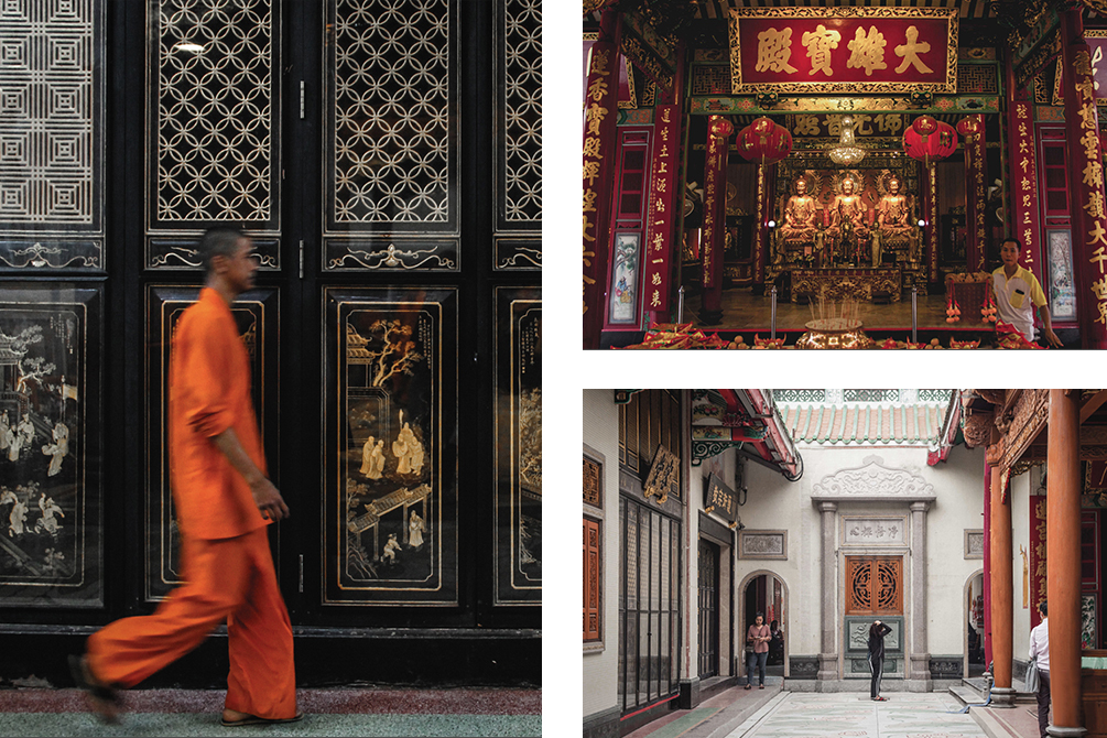 วัดแรกที่เราอยากพาไปรู้จักคือ วัดมังกรกมลาวาส หรือที่รู้จักกันในนาม ‘วัดเล่งเน่ยยี่’ เป็นวัดจีนเก่าแก่ของย่านเยาวราช และเป็นสถานที่สำคัญในการทำพิธีต่าง ๆ ทั้งเทศกาลปีใหม่ กินเจ และตรุษจีน สถาปัตยกรรมของวัดโดดเด่นด้วยการวางผังแบบวังหลวงแต้จิ๋วโบราณและมีการใช้ไม้และอิฐเป็นวัสดุหลักในการก่อสร้าง หลังคามุงด้วยกระเบื้องดินเผาและประดับประดาด้วยลวดลายสิริมงคลตามความเชื่อจีนโบราณ ภายในวัดมีเทพเจ้าประดิษฐานเทพเจ้าทั้งหมด 58 องค์ แต่เทพเจ้าที่นิยมกราบไหว้บูชาขอพรคือ พระศากยมุนีพุทธเจ้า พระอมิตาภพุทธเจ้า พระไภษัชยคุรุพุทธเจ้า วิหารด้านหน้าประดิษฐานท้าวจตุโลกบาล ข้างละ 2 องค์ นอกจากมาไหว้พระขอพรเพื่อความเป็นสิริมงคล โดยเฉพาะในเรื่องค้าขายให้เจริญรุ่งเรืองแล้ว วัดเล่งเน่ยยี่ยังมีชื่อเสียงและเป็นที่นิยมในการแก้ชง ซึ่งในแต่ละปีจะเห็นผู้คนทั้งชาวไทยและต่างชาตินิยมมาสะเดาะเคราะห์ปีชงกันอย่างไม่ขาดสาย