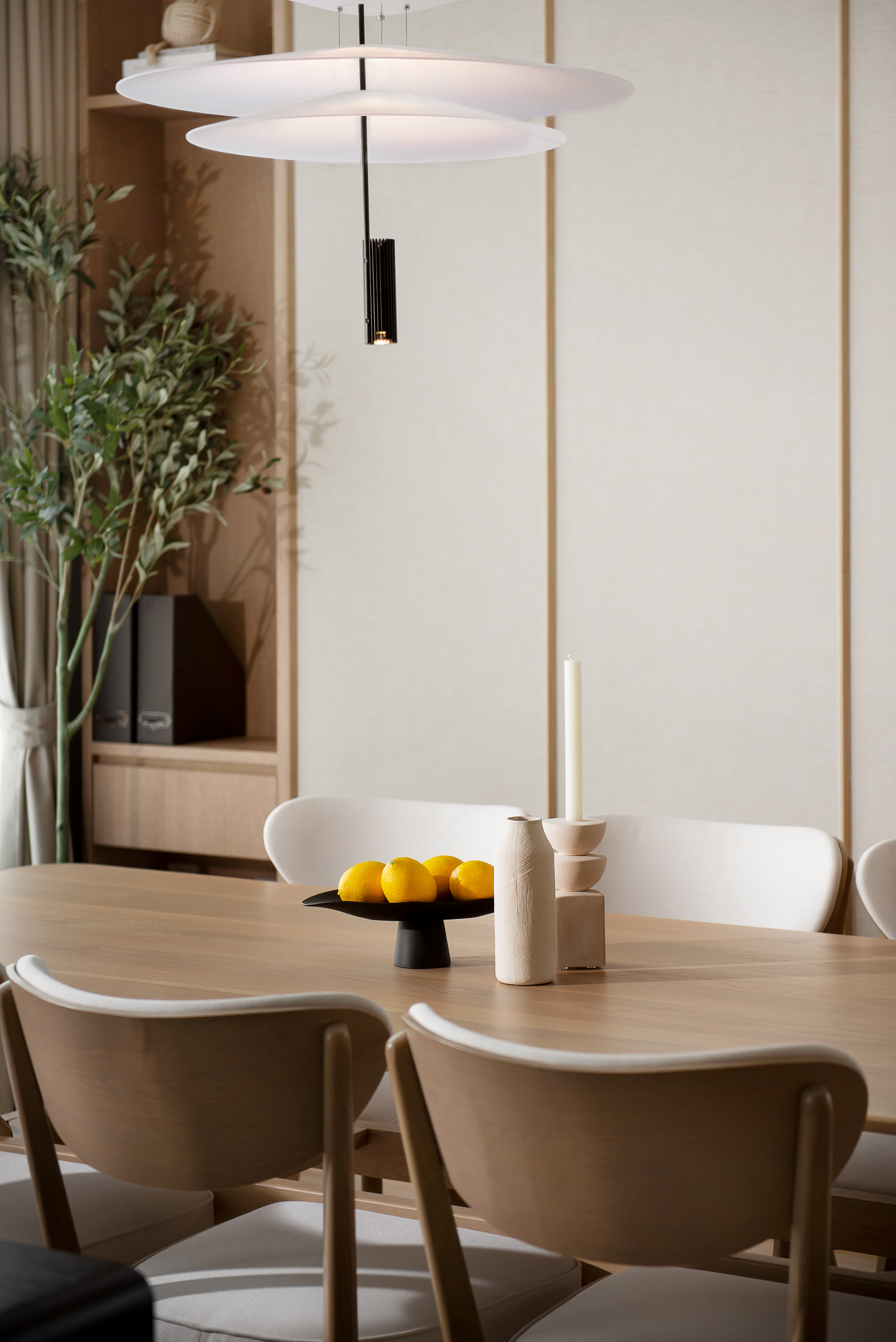 จะสังเกตว่าจุดต่าง ๆ ของห้องมีการใช้เส้น Slim Line เพื่อนำจุดสายตา และเลือกใช้เฟอร์นิเจอร์ที่ผสมผสานงานคราฟต์และสั่งทำขึ้นมาเป็นพิเศษ ช่วยให้ห้องเป็น Photogenic ที่โดดเด่นและมีเอกลักษณ์