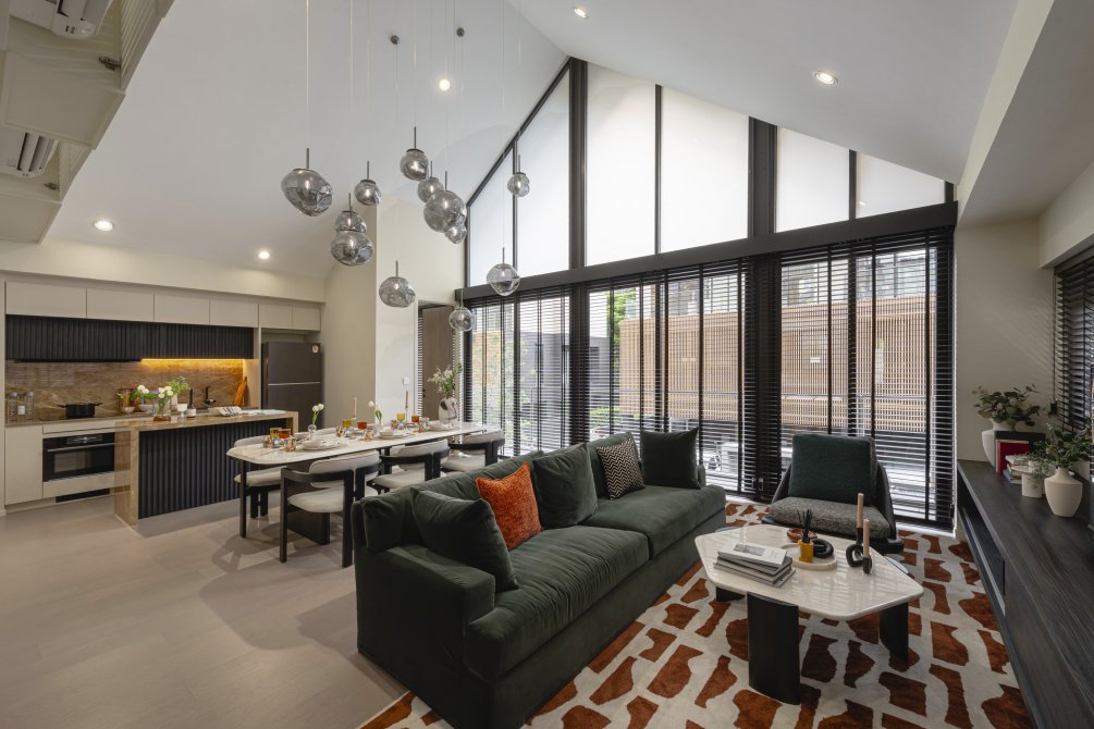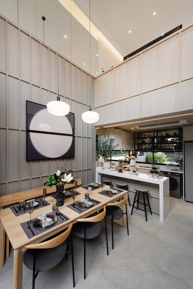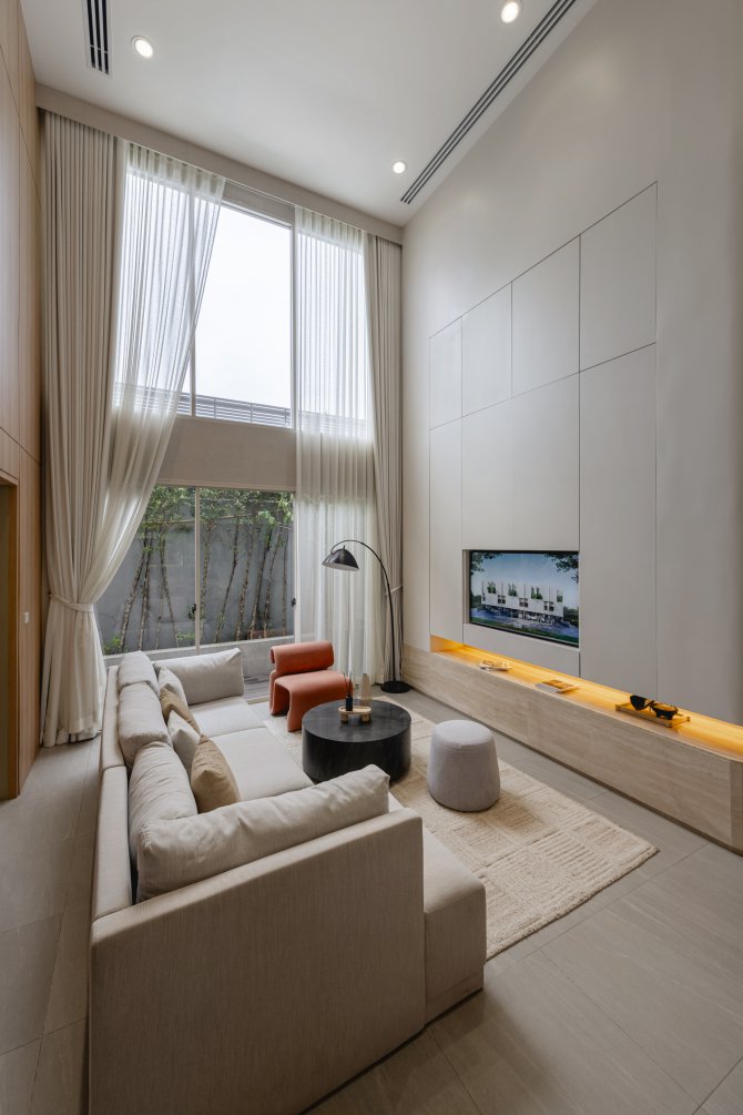 • Double Volume Living Space : การออกแบบเพดานสูงในบริเวณห้องนั่งเล่นให้ความรู้สึกโล่ง โปร่งสบาย เปิดรับแสงธรรมชาติเข้าสู่พื้นที่กลางบ้านอย่างพอดี เหมาะกับทั้งวันพักผ่อน และการใช้ชีวิตแบบ Work From Home โดยพื้นที่นี้ออกแบบมาให้รองรับ ทุกอารมณ์ของวัน ไม่ว่าจะอยากสงบ หรืออยากสดชื่น พื้นที่นี้ก็พร้อมซัพพอร์ตเสมอ