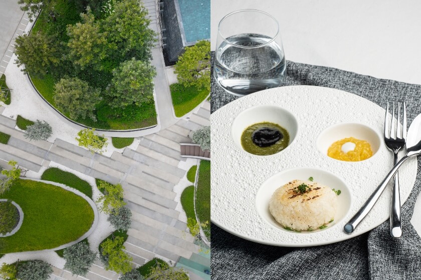 • Dessert : ปิดท้ายด้วย 'Shades of Greens เมนูของหวานที่นำเสนอความเขียวขจีของสวนขนาดใหญ่ ผ่านเจลลี่สีเขียวเฉดต่าง หลากรสชาติ ทั้ง Jasmine รสเบา และ Shiso-Lime, Melon-Blue Cheese และ Green tea-Mint สื่อถึงบรรยากาศความร่มรื่นของพื้นที่สีเขียวภายในโครงการ