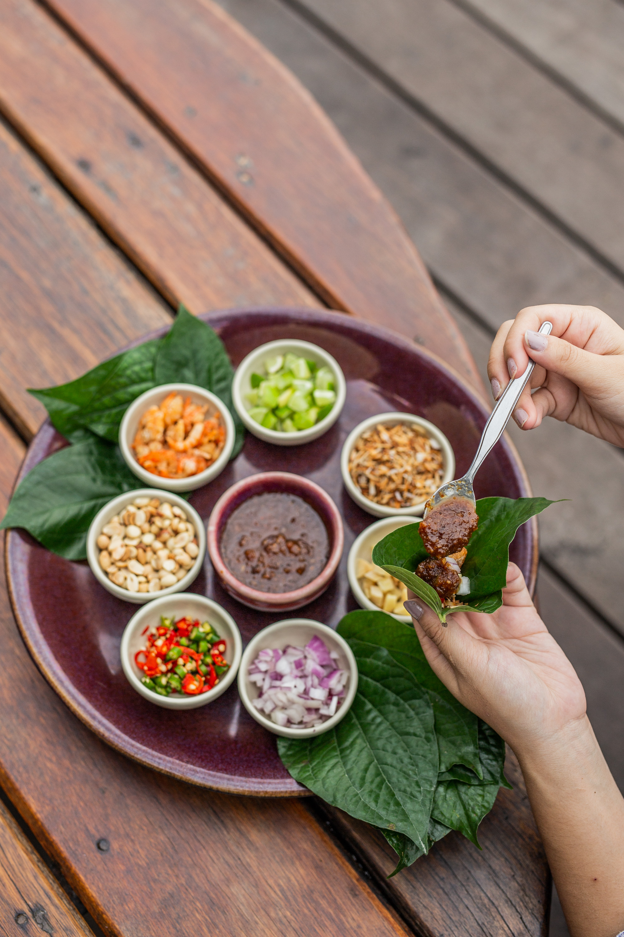 เริ่มต้นรองท้องกันด้วยเมนูอาหารว่างแบบไทย ๆ ที่ทางร้านแนะนำให้ลองสั่งอย่าง เมี่ยงคำ (190 บาท) เมนูซิกเนเจอร์ของทางร้าน ซึ่งถ้าไม่ได้สั่งก็เหมือนมาไม่ถึง โดยทางร้านจะเสิร์ฟเป็นชุดเครื่องเมี่ยงคำเซ็ตใหญ่และน้ำจิ้มรสเด็ด มาพร้อมกับใบเมี่ยงคำ