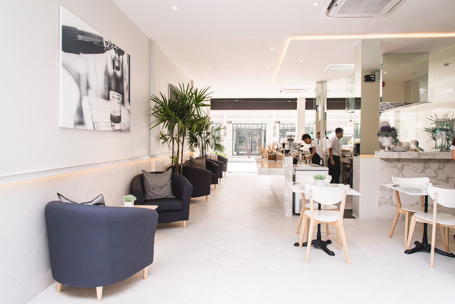 ตัวร้านเลือกใช้สีขาวสะอาดตาเป็นหลักเช่นเดียวกับโรงแรม K Maison โดยฉาบผนังด้วยปูนสีขาวสว่างและปูพื้นกระเบื้องสีขาวทำให้ร้านดูกว้างขวาง เพิ่มลุคเท่ ๆ ด้วยการติดรูปโทนขาวดำบนผนัง พร้อมกับเลือกใช้โต๊ะและบาร์หินอ่อนเพื่อให้เกิดความเรียบหรูกับตัวร้านได้อย่างมีสไตล์ พื้นที่ด้านในร้านประหยัดพลังงานด้วยการใช้เพดานแบบ Skylight ให้ได้แสงสว่างจากธรรมชาติและยังนำต้นไม้เล็ก ๆ มาวางประดับไว้บนโต๊ะและผนังทำให้มีสีสันและดูสบายตา ใครที่แวะมาสามารถนั่งจิบกาแฟได้ที่โซฟาทรงเตี้ยข้างกำแพง นั่งทานอาหารได้ที่โต๊ะกลางร้าน หรือจะเลือกนั่งที่บาร์ติดกับครัวเปิดกลางร้านเพื่อดูการทำอาหารกันแบบใกล้ชิด