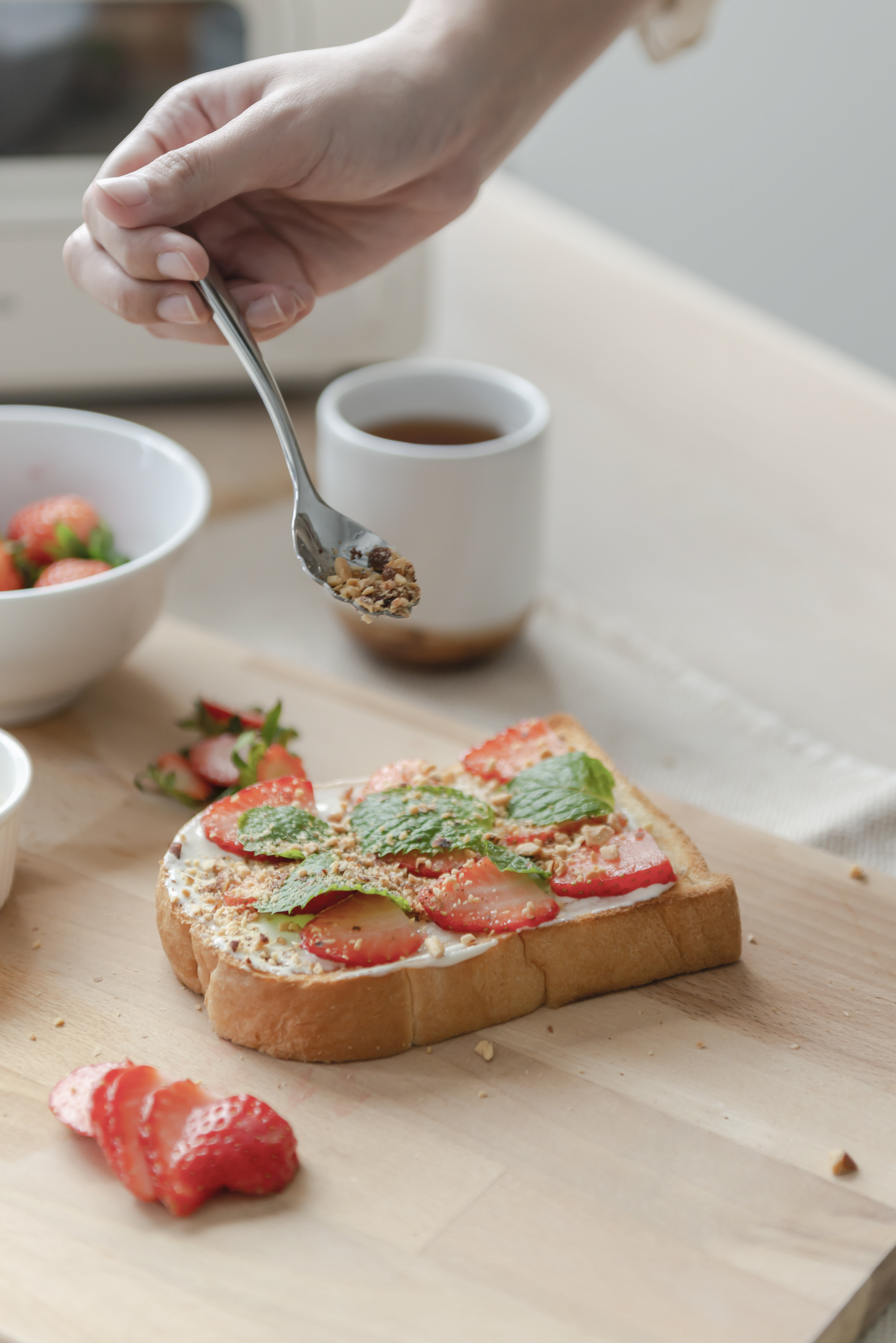 จัดวางสตรอเบอร์รีลงบนขนมปังให้สวยงาม