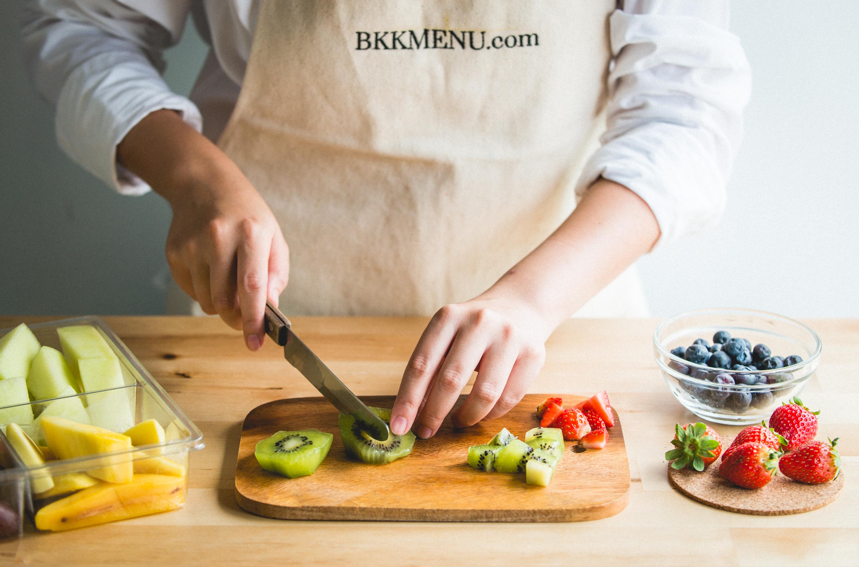 1. หั่นผลไม้ชนิดต่าง ๆ ขนาดเล็กกำลังดี แล้วนำผลไม้ที่หั่นใส่แก้ว