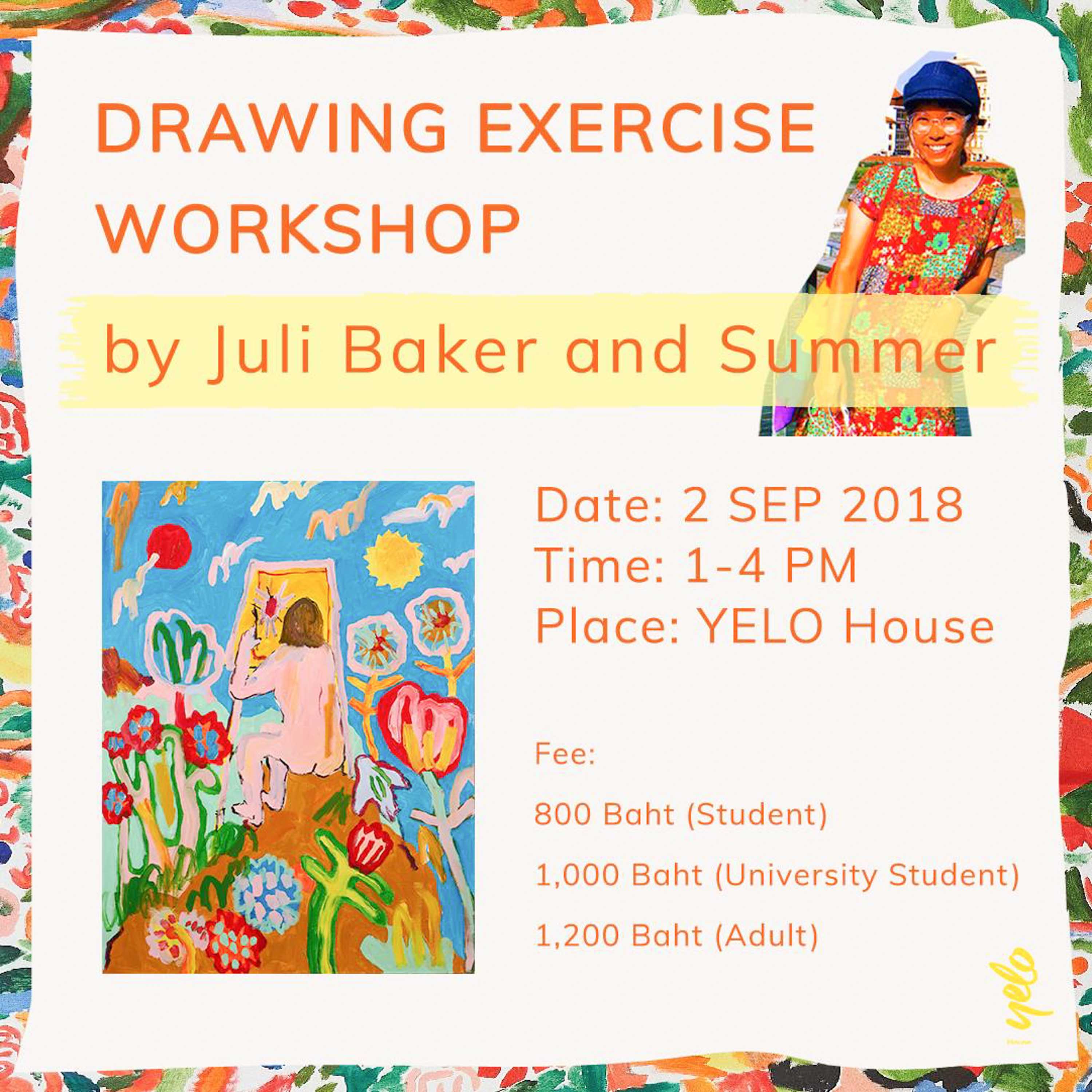 มาเริ่มกันที่คลาสแรกจากศิลปินชื่อดัง ป่าน – ชนารดี ฉัตรกุล ณ อยุธยา หรือ Juli Baker and Summer จัดกิจกรรมสุดพิเศษที่งาน Based on True Stories A Duet Exhibition by Juli Baker & Jaruwat ซึ่งมาพร้อมกับสีสันและการแต่งแต้มจินตนาการแบบฉบับเฉพาะตัว โดยเธอจะมาเผยเทคนิคและแบบฝึกหัดที่จะช่วยให้เราสนุกกับการวาดรูประบายสีมากขึ้น โดยผู้เข้าร่วมจะได้ทำโจทย์ที่ท้าทายประสาทสัมผัส และข้อจำกัดที่อาจจะเป็นแรงกระตุ้นให้เกิดงานที่แปลกใหม่ เช่น การลองวาดรูปด้วยมือข้างที่ไม่ถนัด การวาดรูปจากเพลง เป็นต้น