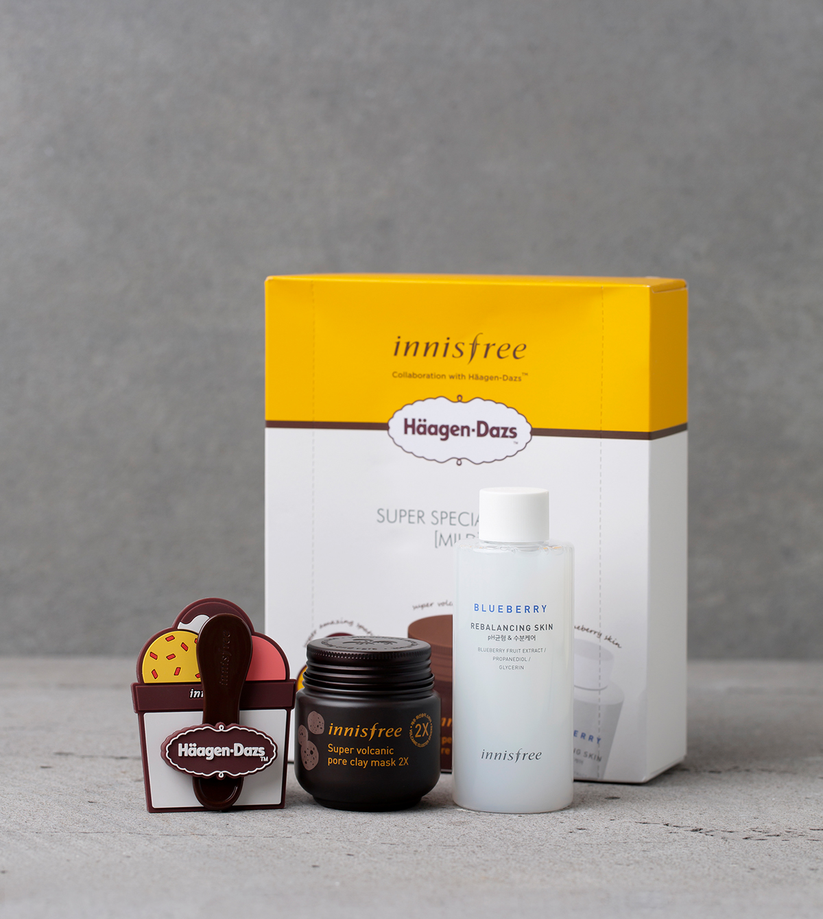 Innisfree แบรนด์ผลิตภัณฑ์เครื่องสำอางธรรมชาติจากประเทศเกาหลี ร่วมกับ Häagen Dazs แบรนด์ไอศกรีมระดับพรีเมียมสัญชาติอเมริกันครีเอทผลิตภัณฑ์คอลเล็คชั่นพิเศษที่มีชื่อว่า ‘Innisfree x Häagen Dazs : Super Special Pack-Volcanic clay Summer Edition’ ภายในเซ็ตประกอบด้วย Super Volcanic Pore Clay Mask 2x มาส์กโคลนภูเขาไฟ รูปแบบเนื้อมูสที่ช่วยผลัดเซลล์ผิว ขจัดความมัน และกระชับรูขุมขนให้ดูเรียบเนียน น่าสัมผัส และ Blueberry Rebalancing Skin โทนเนอร์ที่อุดมไปด้วยสารสกัดจากบลูเบอร์รี่ ช่วยปรับสภาพผิวให้เรียบเนียน อิ่มน้ำ เตรียมผิวให้พร้อมสำหรับการแต่งหน้าในขั้นตอนต่อไป