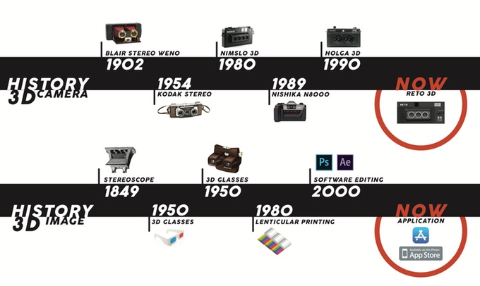 โดยล่าสุด โปรเจ็กต์ Kickstarter จากผู้ผลิต Retro ก็ได้มีการผลิตกล้อง 3D Film Camera รุ่น RETO3D กล้องถ่ายรูปที่ให้คุณภาพเหมือนกับภาพฟิล์ม อีกทั้งยังเป็นภาพแบบ 3D Photo ที่กำลังมาแรงในขณะนี้เสียด้วย อย่างที่ทราบกันดีว่า ภาพถ่าย 3 มิตินั้น จัดอยู่ในประเภทฟิล์มภาพถ่ายแบบเฉพาะ ขนาดที่ว่าตลาดกล้องฟิล์มที่จำหน่ายกล้องฟิล์ม 3 มิติมือสอง ราคาก็ยังคงไม่เป็นที่แน่นอน จากการวิเคราะห์ กล้องฟิล์ม 3 มิติ รุ่น RETO3D (ราคาเต็มอยู่ที่ประมาณ 3,500 บาท) นั้นมีขนาดเล็กและน้ำหนักเบา ใช้งานง่าย มีแฟลช มี 3 เลนส์ในตัว และแน่นอนว่าเซฟภาพฟิล์มได้ รวมถึงมีการพัฒนาแอปพลิเคชันที่สามารถทำ 3D GIFs พร้อมฟิลเตอร์ต่าง ๆ ให้เลือกได้อย่างง่ายดายแบบจบครบในกล้องเดียวรายละเอียดเพิ่มเติม