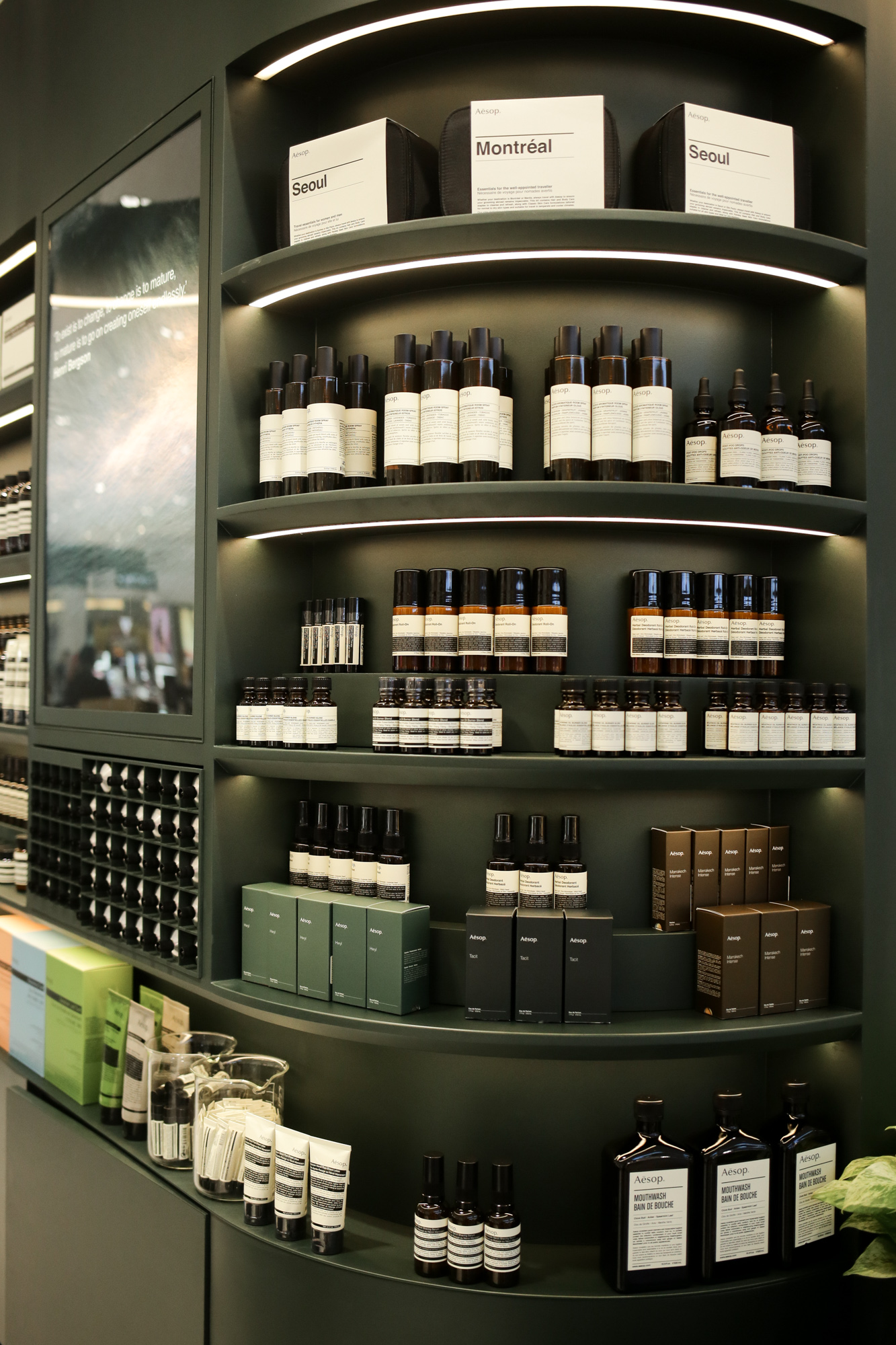 หลังจากเปิดให้บริการมาทั้งหมด 5 สาขาแล้ว ชาวบางนาสามารถพบกับเคาน์เตอร์ Aēsop สาขาใหม่ล่าสุดที่ Central Bangna ได้ตั้งแต่วันนี้เป็นต้นไป โดยประกอบไปด้วยโซนจำหน่ายสินค้า และโซนของการทดลองผลิตภัณฑ์ ออกแบบและดีไซน์ภายใต้คอนเซ็ปต์ของการนำธรรมชาติเข้ามาผสมผสาน ซึ่งได้มีการออกแบบร่วมมือกับทีมสถาปนิกจาก ‘รัซเซล แอนด์ จอร์จ’ (Russell & George) เด่นชัดด้วยโลหะอมสีเขียวเข้ม เช่นเดียวกับสีเขียวของต้นไม้ใหญ่ในป่า ให้พื้นผิวสัมผัสระนาบที่ต่อเนื่อง ทำให้เกิดพื้นที่ใช้สอยภายในมากขึ้น ตามมาด้วยสันขอบที่เหลาให้โค้งมนเล็กน้อย และการออกแบบช่องเงาที่จัดวางอย่างบรรจง ทำให้เห็นคุณค่าความงามของเนื้อวัสดุอย่างเต็มที่ ด้านเบาะรองนั่งทำจากหนัง สอดประสานเข้ากับชั้นวางสินค้า ที่ตกแต่งด้วยไม้ประดับสีเขียวชอุ่มเพื่อเติมความสดชื่นและสบายตา โดยมีการจัดวางให้กิ่งก้านยื่นออกมาตลอดหลังแนวที่นั่ง ตัดกับพื้นหินอ่อนสีเทาขาวดั้งเดิมของทางห้างฯ เป็นการจับคู่วัสดุที่แตกต่างให้อยู่ด้วยกันอย่างสวยงาม กลมกลืน และน่าสนใจ